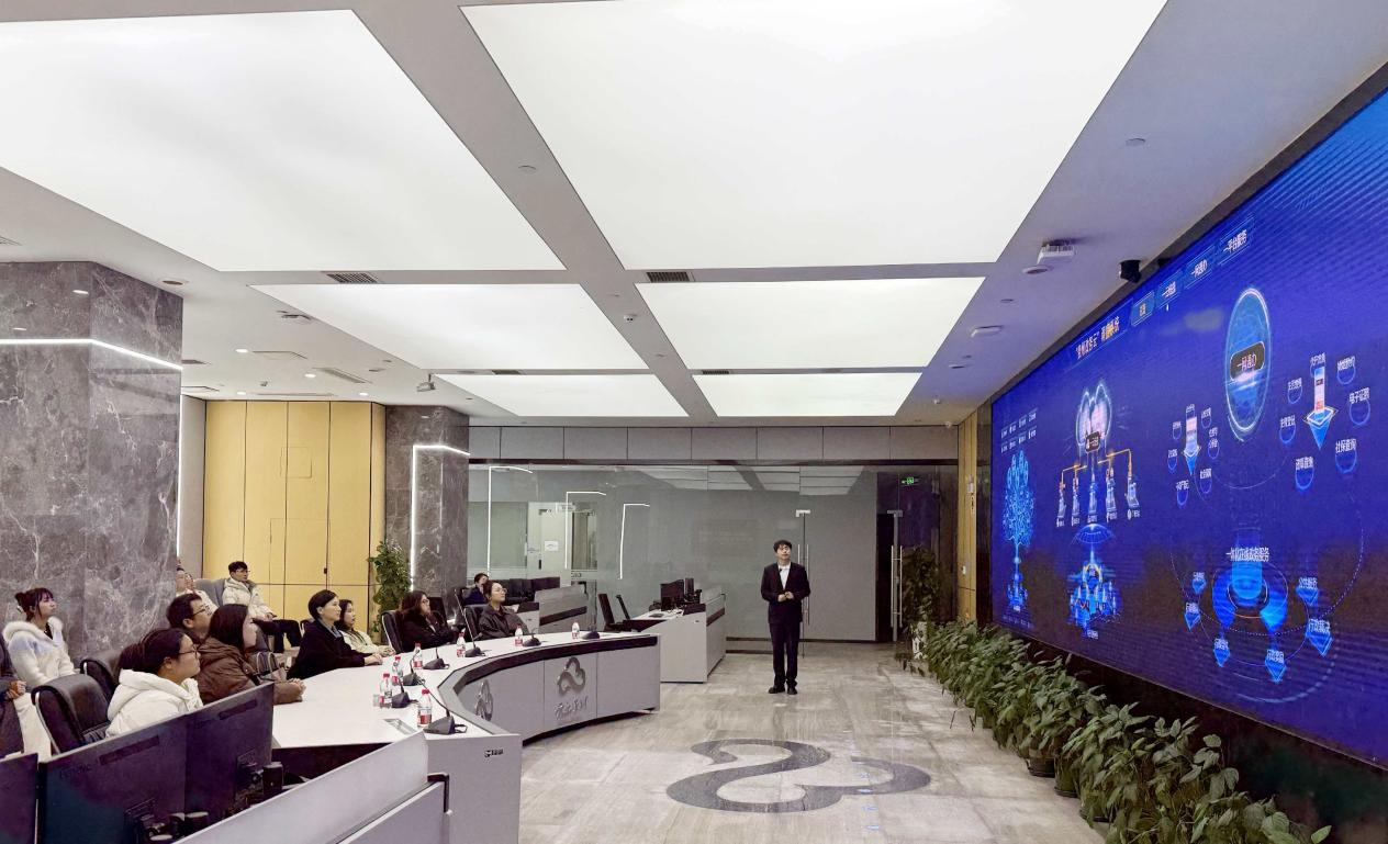 随后,师生一行前往贵州大数据产业集团继续开展深入学习。实务专家为学生讲解了省级政务数据共享交换平台的运行机制、重要基础数据库的建设情况,以及政务数据从归集、开放到治理场景应用的全流程体系。在集团调度中心与数字展厅,通过“贵阳城市运行中心”“贵州政务服务网”等典型平台的实时演示,学生近距离理解感知了大数据赋能城市“智理”、提升政府协同效率和应急响应能力的强大效能。学生围绕政务数据收集、政务数据共享与开放、数据场景开发应用和数据安全与隐私保护等议题,与实务专家进行了热烈而深入的交流。