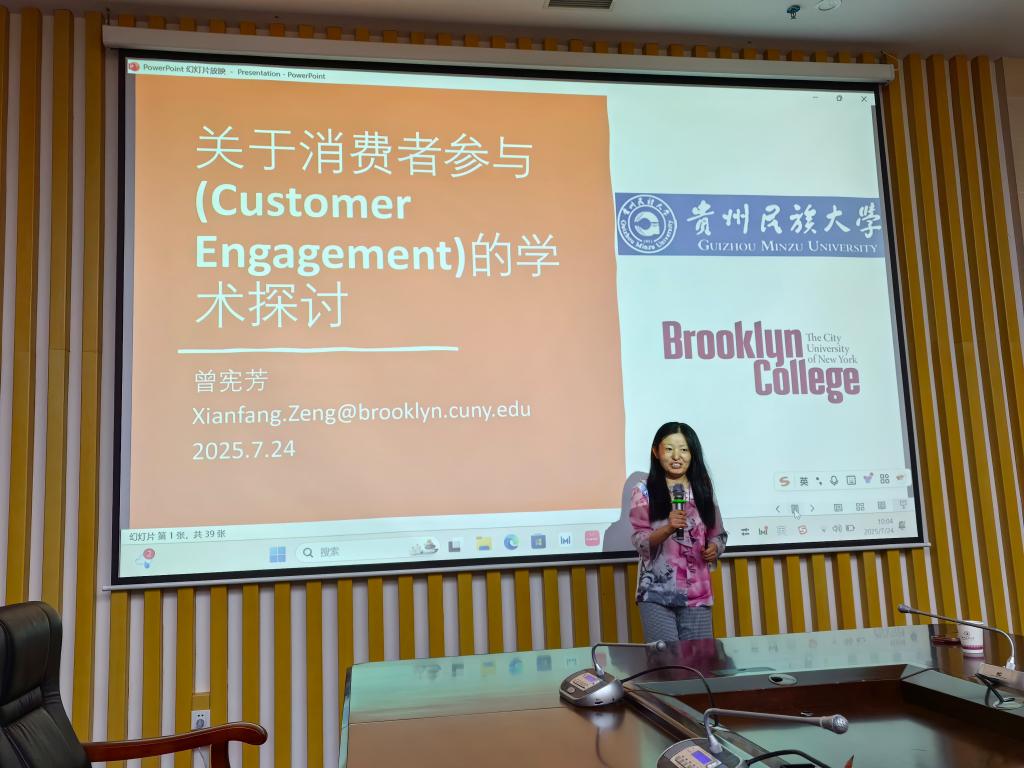 2025年7月24日上午,纽约城市大学商学院曾宪芳教授应邀到pbw必威西汉姆联作学术指导,为betway西汉姆作“消费者参与”主题学术报告,探讨对比亚迪等中国品牌的思考,分享了自己的消费者参与理论和实证研究成果,我院党政班子成员、工商管理类、经济学类骨干教师参加。此次学术交流,开阔了学科视野,对进一步加强我院国际交流有积极意义。